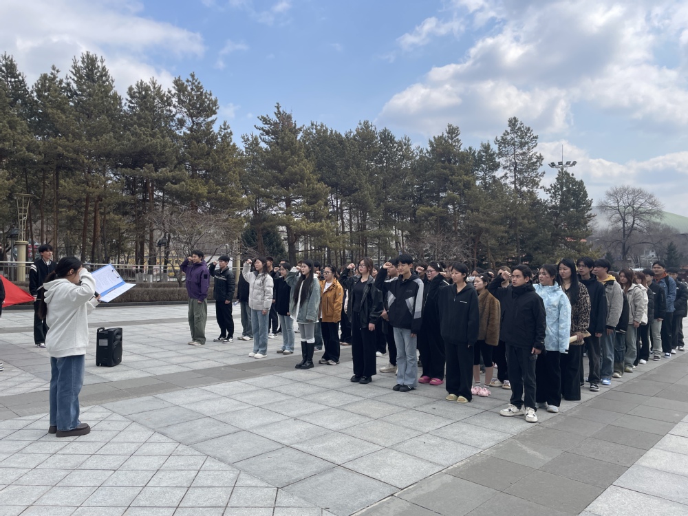 体育部与学前教育系的师生们到北山公园抗日战争暨爱国自卫战争殉难烈士纪念碑前通过向烈士默哀致敬、献花及重温入团誓词沉痛悼念抗日英雄。